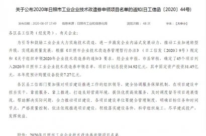 根據(jù)《日照市企業(yè)技術(shù)改造券管理暫行辦法》(日工信發(fā)〔2020〕9號)規(guī)定和《關(guān)于組織申領(lǐng)2020年企業(yè)技術(shù)改造券的通知》要求,經(jīng)積極申報,通過市工業(yè)和信息化局審核,成功申領(lǐng)2020年日照市工業(yè)企業(yè)技術(shù)改造券。